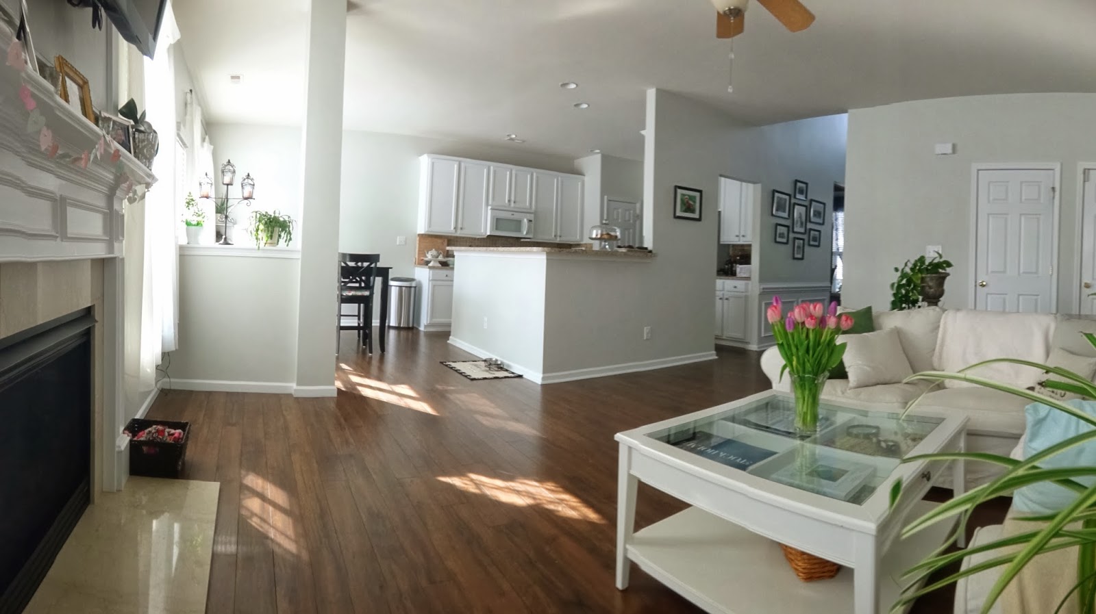 We spent our sunny hours getting some more of the quarter round in and finally getting around to organizing the house and taking our "After" photos of the floor in the living room and kitchen.