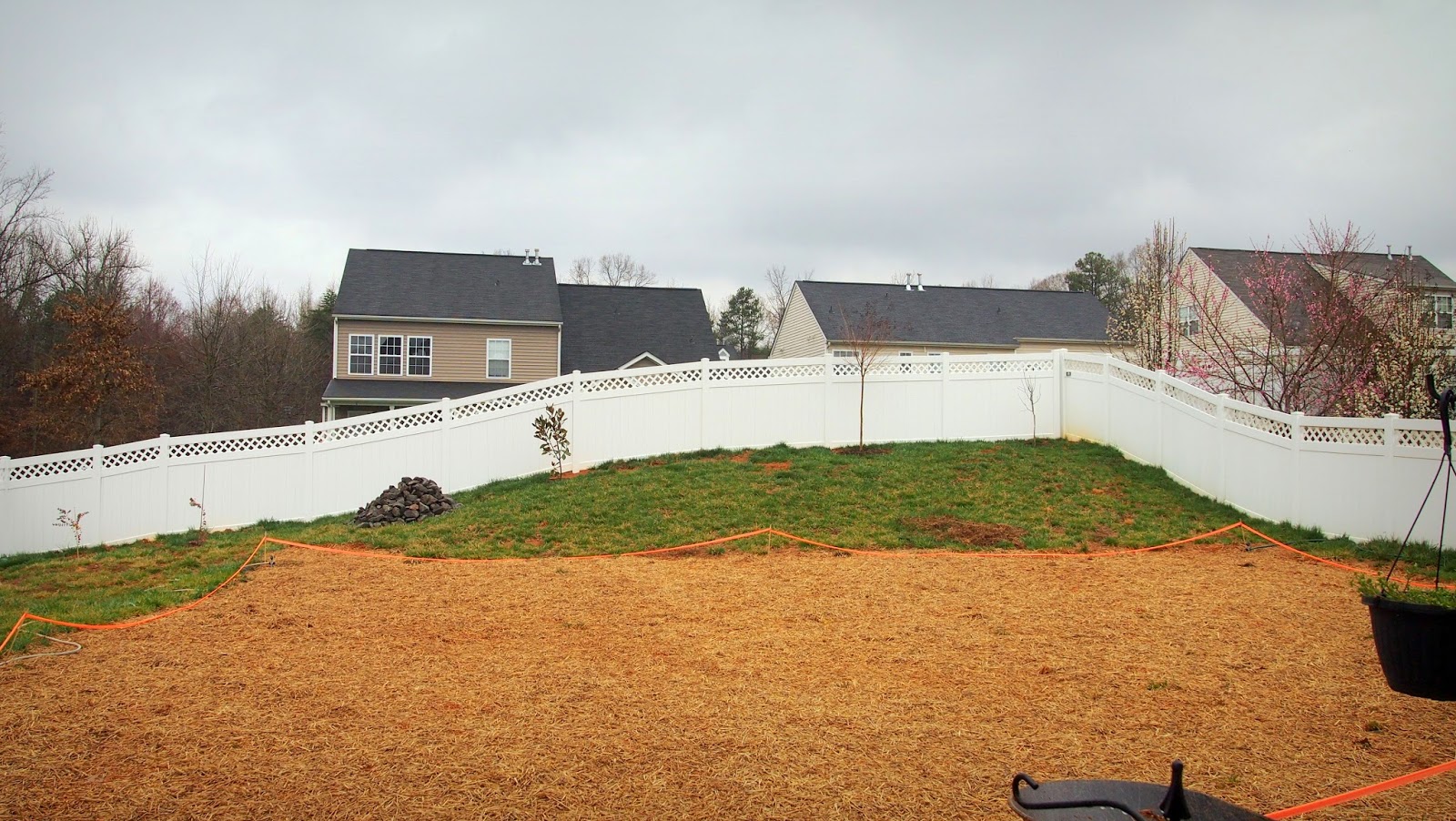 We did get about 1.5 cubic yards of mulch last weekend, but instead of along our fence, it was utilized in two other much needed areas: the front garden bed and around our trees. Now these spaces look fresh and neat. We get so much shade in this North facing garden, that I couldn't help but get some beautiful Hostas to brighten up the area. I don't really know why, but I LOVE Hostas. I think they remind me of New York and New England landscaping. Maybe it is a way to bring a bit of that to my new home here in the South. The "Patriot" variety is a real favorite with the lovely contrasting white edges and vivid green leaves.