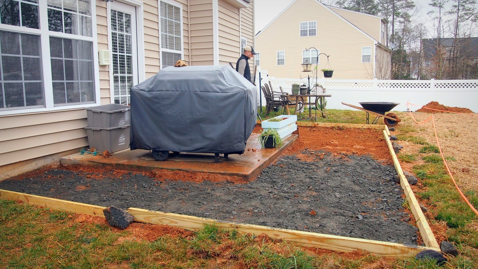 our current (10x8 ft) cement patio and laying the first inch of gravel.