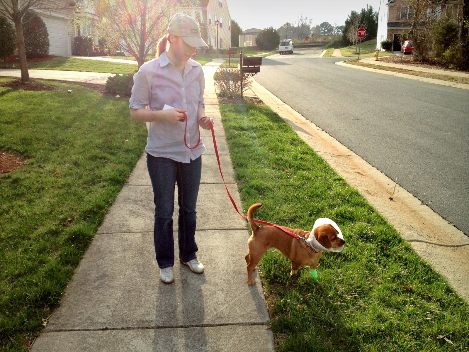 We couldn't help but smile when she hobbled down the road battling with the cone and bandage. |